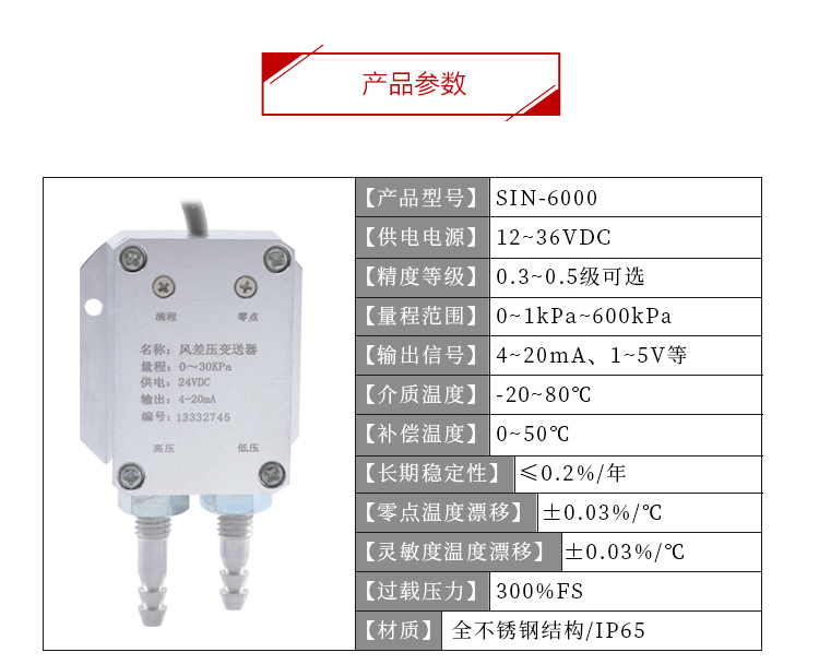 SIN6000型風差壓傳感器采用OEM硅壓阻式差壓芯體組裝而成。外殼為鋁合金結構兩個壓力接口為M10螺紋和旋塞結構(用戶可選擇壓力接口尺寸),可直接在測量管道上或通過引壓管連接。SIN6000型有毫伏、標準電壓、電流、頻率信號輸出等可供選擇,安裝使用方便,廣泛應用于鍋爐送風、井下通風等電力、煤炭行業壓力過程控制領域。