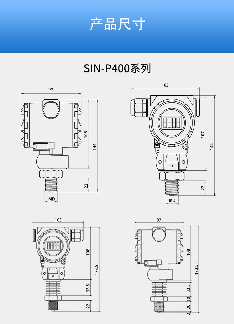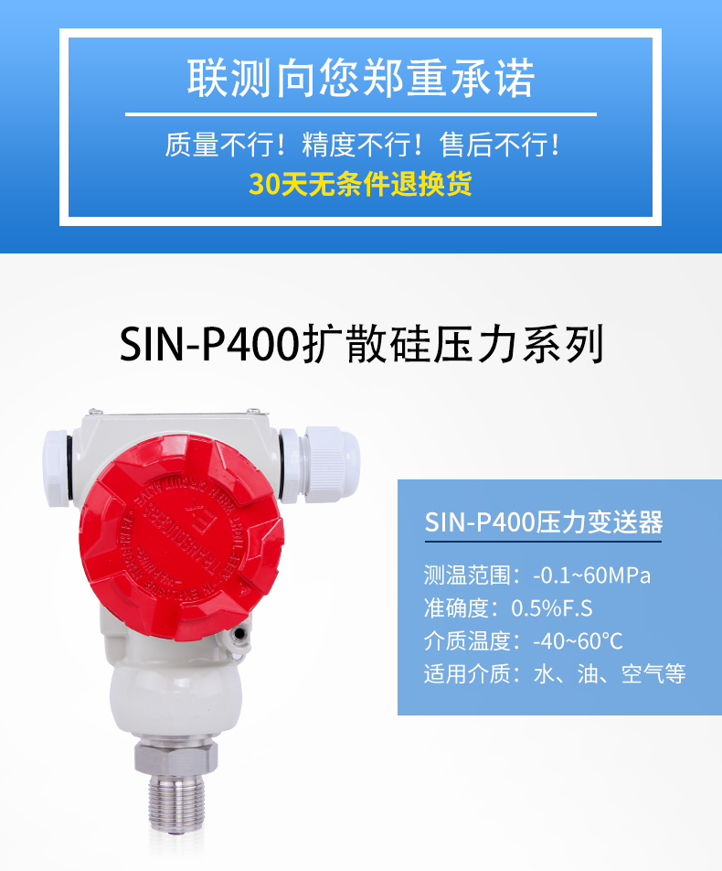 聯測_SIN-P400_2088型壓力變送器_精度0.5%榔頭型_可帶顯示 P400全數字電路保證精度,保證長期零點和線性穩定,現場液晶顯示,多種量程選擇,防雷擊,防射頻干擾,液晶顯示可通過按鍵調整零點和量程,方便用戶調試。